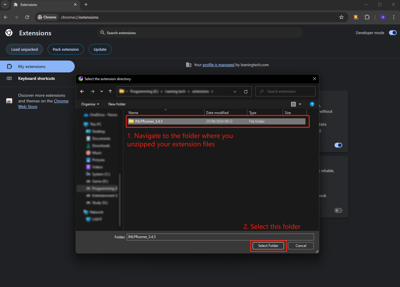 Let’s now click on Load unpacked and navigate to the folder where you unzipped your extension files. Select the folder and confirm to load the extension into Chrome.